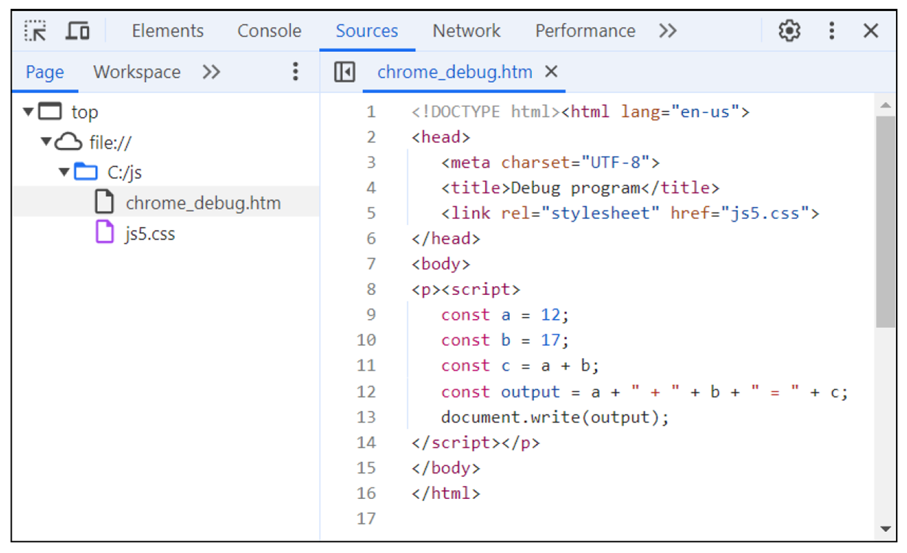 As an example, a program in the chrome_debug.htm file is used in which two numbers are added. In the next figure, you can see the default output of the program.