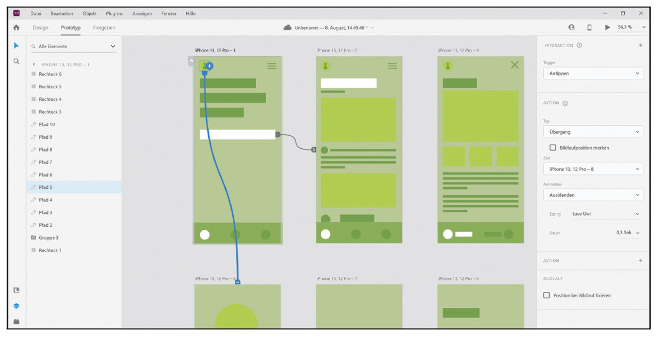 Adobe XD, as shown in the next figure, is a prototyping tool from the Adobe family, meaning the tool is ideally linked to other suite applications like Adobe Photoshop or Adobe Illustrator. This integration is an advantage over the other two tools, especially when working extremely visually. Even though we are still in the realm of click dummies with Adobe XD, we consider great visual design as vitally important since additional effort can be avoided later if the rendering is done in the same tool as the wireframing.